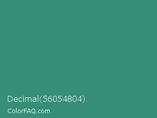 Decimal 56054804 Color is a normal cyan color and the nearest color is Illuminating Emerald #319177. Hex code #368e76 and RGB value is rgb(54,142,118). In RGB color space, this color is composed of 21% red, 56% green, 46% blue, In CMYK color space, this color is composed of 62% cyan, 0% magenta, 17% yellow , 44% black , In HSL color space, this color has a hue angle of 164° , 45% saturation and 38% lightness.