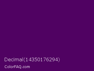 Decimal 14350176294 Color is a very dark purple color and the nearest color is Clairvoyant #480656. Hex code #500262 and RGB value is rgb(80,2,98). In RGB color space, this color is composed of 31% red, 1% green, 38% blue, In CMYK color space, this color is composed of 18% cyan, 98% magenta, 0% yellow , 62% black , In HSL color space, this color has a hue angle of 289° , 96% saturation and 20% lightness.