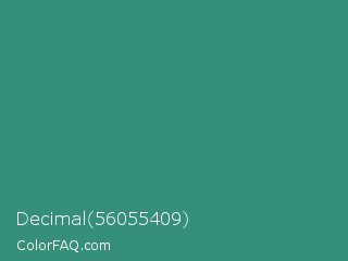 Decimal 56055409 Color is a normal cyan color and the nearest color is Illuminating Emerald #319177. Hex code #368f77 and RGB value is rgb(54,143,119). In RGB color space, this color is composed of 21% red, 56% green, 47% blue, In CMYK color space, this color is composed of 62% cyan, 0% magenta, 17% yellow , 44% black , In HSL color space, this color has a hue angle of 164° , 45% saturation and 39% lightness.