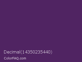 Decimal 14350235440 Color is a dark purple color and the nearest color is Bossanova #4e2a5a. Hex code #502462 and RGB value is rgb(80,36,98). In RGB color space, this color is composed of 31% red, 14% green, 38% blue, In CMYK color space, this color is composed of 18% cyan, 63% magenta, 0% yellow , 62% black , In HSL color space, this color has a hue angle of 283° , 46% saturation and 26% lightness.