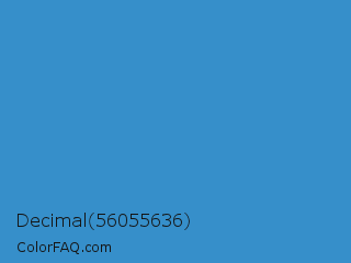 Decimal 56055636 Color is a normal blue color and the nearest color is Curious Blue #2596d1. Hex code #368fca and RGB value is rgb(54,143,202). In RGB color space, this color is composed of 21% red, 56% green, 79% blue, In CMYK color space, this color is composed of 73% cyan, 29% magenta, 0% yellow , 21% black , In HSL color space, this color has a hue angle of 204° , 58% saturation and 50% lightness.