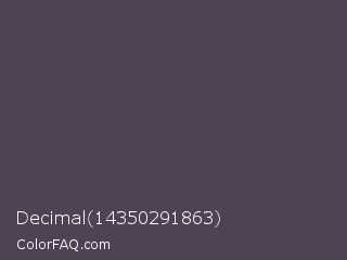 Decimal 14350291863 Color is a dark purple color and the nearest color is Mortar #504351. Hex code #504255 and RGB value is rgb(80,66,85). In RGB color space, this color is composed of 31% red, 26% green, 33% blue, In CMYK color space, this color is composed of 6% cyan, 22% magenta, 0% yellow , 67% black , In HSL color space, this color has a hue angle of 284° , 13% saturation and 30% lightness.