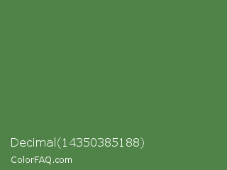 Decimal 14350385188 Color is a normal green color and the nearest color is Hippie Green #53824b. Hex code #508348 and RGB value is rgb(80,131,72). In RGB color space, this color is composed of 31% red, 51% green, 28% blue, In CMYK color space, this color is composed of 39% cyan, 0% magenta, 45% yellow , 49% black , In HSL color space, this color has a hue angle of 112° , 29% saturation and 40% lightness.