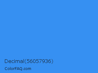 Decimal 56057936 Color is a normal blue color and the nearest color is Bleu De France #318ce7. Hex code #3690f2 and RGB value is rgb(54,144,242). In RGB color space, this color is composed of 21% red, 56% green, 95% blue, In CMYK color space, this color is composed of 78% cyan, 40% magenta, 0% yellow , 5% black , In HSL color space, this color has a hue angle of 211° , 88% saturation and 58% lightness.