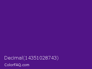 Decimal 14351028743 Color is a dark purple color and the nearest color is KSU Purple #512888. Hex code #511487 and RGB value is rgb(81,20,135). In RGB color space, this color is composed of 32% red, 8% green, 53% blue, In CMYK color space, this color is composed of 40% cyan, 85% magenta, 0% yellow , 47% black , In HSL color space, this color has a hue angle of 272° , 74% saturation and 30% lightness.