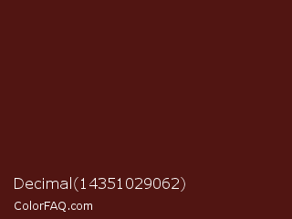 Decimal 14351029062 Color is a very dark red color and the nearest color is Heath #541012. Hex code #511512 and RGB value is rgb(81,21,18). In RGB color space, this color is composed of 32% red, 8% green, 7% blue, In CMYK color space, this color is composed of 0% cyan, 74% magenta, 78% yellow , 68% black , In HSL color space, this color has a hue angle of 3° , 64% saturation and 19% lightness.