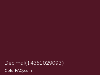 Decimal 14351029093 Color is a very dark rose color and the nearest color is Cocoa Bean #481c1c. Hex code #511525 and RGB value is rgb(81,21,37). In RGB color space, this color is composed of 32% red, 8% green, 15% blue, In CMYK color space, this color is composed of 0% cyan, 74% magenta, 54% yellow , 68% black , In HSL color space, this color has a hue angle of 344° , 59% saturation and 20% lightness.