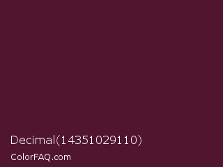 Decimal 14351029110 Color is a very dark rose color and the nearest color is Wine Berry #591d35. Hex code #511530 and RGB value is rgb(81,21,48). In RGB color space, this color is composed of 32% red, 8% green, 19% blue, In CMYK color space, this color is composed of 0% cyan, 74% magenta, 41% yellow , 68% black , In HSL color space, this color has a hue angle of 333° , 59% saturation and 20% lightness.
