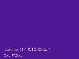 Decimal 14351030665 Color is a normal violet color and the nearest color is Daisy Bush #4f2398. Hex code #511795 and RGB value is rgb(81,23,149). In RGB color space, this color is composed of 32% red, 9% green, 58% blue, In CMYK color space, this color is composed of 46% cyan, 85% magenta, 0% yellow , 42% black , In HSL color space, this color has a hue angle of 268° , 73% saturation and 34% lightness.