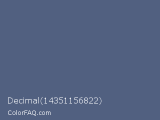 Decimal 14351156822 Color is a normal blue color and the nearest color is Paynes Grey #536878. Hex code #516080 and RGB value is rgb(81,96,128). In RGB color space, this color is composed of 32% red, 38% green, 50% blue, In CMYK color space, this color is composed of 37% cyan, 25% magenta, 0% yellow , 50% black , In HSL color space, this color has a hue angle of 221° , 22% saturation and 41% lightness.