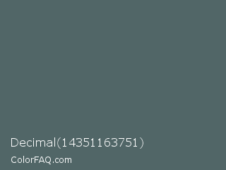 Decimal 14351163751 Color is a normal cyan color and the nearest color is Stormcloud #4f666a. Hex code #516667 and RGB value is rgb(81,102,103). In RGB color space, this color is composed of 32% red, 40% green, 40% blue, In CMYK color space, this color is composed of 21% cyan, 1% magenta, 0% yellow , 60% black , In HSL color space, this color has a hue angle of 183° , 12% saturation and 36% lightness.