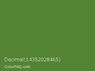 Decimal 14352028465 Color is a normal green color and the nearest color is Sap Green #507d2a. Hex code #528433 and RGB value is rgb(82,132,51). In RGB color space, this color is composed of 32% red, 52% green, 20% blue, In CMYK color space, this color is composed of 38% cyan, 0% magenta, 61% yellow , 48% black , In HSL color space, this color has a hue angle of 97° , 44% saturation and 36% lightness.