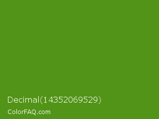 Decimal 14352069529 Color is a normal green color and the nearest color is Vida Loca #549019. Hex code #529417 and RGB value is rgb(82,148,23). In RGB color space, this color is composed of 32% red, 58% green, 9% blue, In CMYK color space, this color is composed of 45% cyan, 0% magenta, 84% yellow , 42% black , In HSL color space, this color has a hue angle of 92° , 73% saturation and 34% lightness.