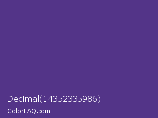 Decimal 14352335986 Color is a normal violet color and the nearest color is Blue Magenta Violet #553592. Hex code #533488 and RGB value is rgb(83,52,136). In RGB color space, this color is composed of 33% red, 20% green, 53% blue, In CMYK color space, this color is composed of 39% cyan, 62% magenta, 0% yellow , 47% black , In HSL color space, this color has a hue angle of 262° , 45% saturation and 37% lightness.