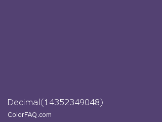Decimal 14352349048 Color is a normal violet color and the nearest color is Cyber Grape #58427c. Hex code #534172 and RGB value is rgb(83,65,114). In RGB color space, this color is composed of 33% red, 25% green, 45% blue, In CMYK color space, this color is composed of 27% cyan, 43% magenta, 0% yellow , 55% black , In HSL color space, this color has a hue angle of 262° , 27% saturation and 35% lightness.
