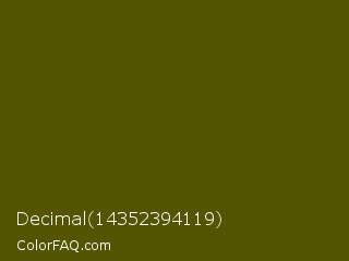 Decimal 14352394119 Color is a very dark yellow color and the nearest color is Verdun Green #495400. Hex code #535503 and RGB value is rgb(83,85,3). In RGB color space, this color is composed of 33% red, 33% green, 1% blue, In CMYK color space, this color is composed of 2% cyan, 0% magenta, 96% yellow , 67% black , In HSL color space, this color has a hue angle of 61° , 93% saturation and 17% lightness.