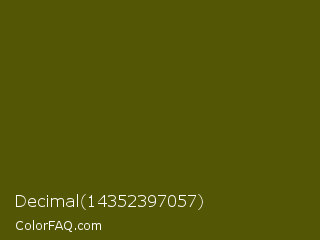Decimal 14352397057 Color is a very dark yellow color and the nearest color is Verdun Green #495400. Hex code #535705 and RGB value is rgb(83,87,5). In RGB color space, this color is composed of 33% red, 34% green, 2% blue, In CMYK color space, this color is composed of 5% cyan, 0% magenta, 94% yellow , 66% black , In HSL color space, this color has a hue angle of 63° , 89% saturation and 18% lightness.