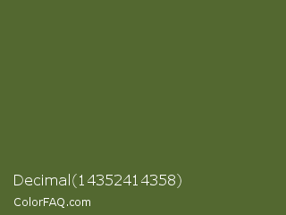 Decimal 14352414358 Color is a dark green color and the nearest color is Dark Olive Green #556b2f. Hex code #536830 and RGB value is rgb(83,104,48). In RGB color space, this color is composed of 33% red, 41% green, 19% blue, In CMYK color space, this color is composed of 20% cyan, 0% magenta, 54% yellow , 59% black , In HSL color space, this color has a hue angle of 83° , 37% saturation and 30% lightness.