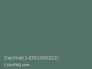 Decimal 14352450323 Color is a normal green color and the nearest color is Cutty Sark #507672. Hex code #537269 and RGB value is rgb(83,114,105). In RGB color space, this color is composed of 33% red, 45% green, 41% blue, In CMYK color space, this color is composed of 27% cyan, 0% magenta, 8% yellow , 55% black , In HSL color space, this color has a hue angle of 163° , 16% saturation and 39% lightness.