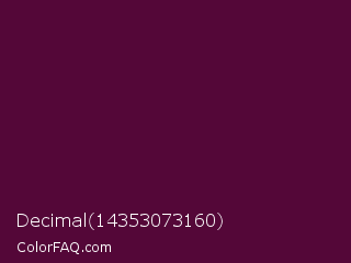 Decimal 14353073160 Color is a very dark magenta color and the nearest color is Mulberry Wood #5c0536. Hex code #540738 and RGB value is rgb(84,7,56). In RGB color space, this color is composed of 33% red, 3% green, 22% blue, In CMYK color space, this color is composed of 0% cyan, 92% magenta, 33% yellow , 67% black , In HSL color space, this color has a hue angle of 322° , 85% saturation and 18% lightness.