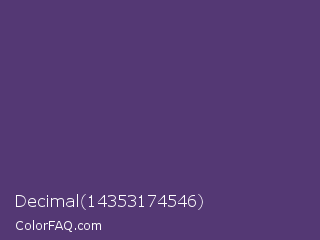 Decimal 14353174546 Color is a normal violet color and the nearest color is Cyber Grape #58427c. Hex code #543874 and RGB value is rgb(84,56,116). In RGB color space, this color is composed of 33% red, 22% green, 45% blue, In CMYK color space, this color is composed of 28% cyan, 52% magenta, 0% yellow , 55% black , In HSL color space, this color has a hue angle of 268° , 35% saturation and 34% lightness.