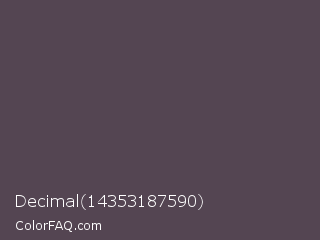 Decimal 14353187590 Color is a dark magenta color and the nearest color is Mortar #504351. Hex code #544552 and RGB value is rgb(84,69,82). In RGB color space, this color is composed of 33% red, 27% green, 32% blue, In CMYK color space, this color is composed of 0% cyan, 18% magenta, 2% yellow , 67% black , In HSL color space, this color has a hue angle of 308° , 10% saturation and 30% lightness.