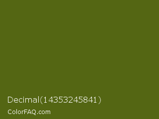 Decimal 14353245841 Color is a dark lime color and the nearest color is Saratoga #555b10. Hex code #546613 and RGB value is rgb(84,102,19). In RGB color space, this color is composed of 33% red, 40% green, 7% blue, In CMYK color space, this color is composed of 18% cyan, 0% magenta, 81% yellow , 60% black , In HSL color space, this color has a hue angle of 73° , 69% saturation and 24% lightness.