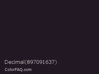 Decimal 897091637 Color is a very dark magenta color and the nearest color is Raisin Black #242124. Hex code #221823 and RGB value is rgb(34,24,35). In RGB color space, this color is composed of 13% red, 9% green, 14% blue, In CMYK color space, this color is composed of 3% cyan, 31% magenta, 0% yellow , 86% black , In HSL color space, this color has a hue angle of 295° , 19% saturation and 12% lightness.
