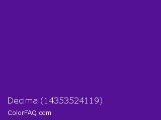 Decimal 14353524119 Color is a normal purple color and the nearest color is Daisy Bush #4f2398. Hex code #551195 and RGB value is rgb(85,17,149). In RGB color space, this color is composed of 33% red, 7% green, 58% blue, In CMYK color space, this color is composed of 43% cyan, 89% magenta, 0% yellow , 42% black , In HSL color space, this color has a hue angle of 271° , 80% saturation and 33% lightness.