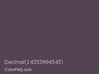 Decimal 14353994545 Color is a dark magenta color and the nearest color is Mortar #504351. Hex code #554353 and RGB value is rgb(85,67,83). In RGB color space, this color is composed of 33% red, 26% green, 33% blue, In CMYK color space, this color is composed of 0% cyan, 21% magenta, 2% yellow , 67% black , In HSL color space, this color has a hue angle of 307° , 12% saturation and 30% lightness.