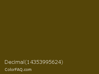 Decimal 14353995624 Color is a very dark yellow color and the nearest color is Bronze Olive #4e420c. Hex code #554508 and RGB value is rgb(85,69,8). In RGB color space, this color is composed of 33% red, 27% green, 3% blue, In CMYK color space, this color is composed of 0% cyan, 19% magenta, 91% yellow , 67% black , In HSL color space, this color has a hue angle of 48° , 83% saturation and 18% lightness.