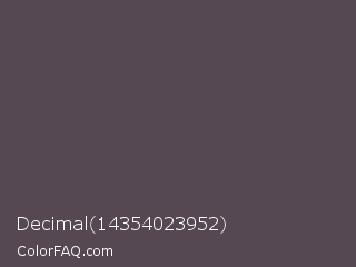 Decimal 14354023952 Color is a normal magenta color and the nearest color is Dark Liver #534b4f. Hex code #554852 and RGB value is rgb(85,72,82). In RGB color space, this color is composed of 33% red, 28% green, 32% blue, In CMYK color space, this color is composed of 0% cyan, 15% magenta, 4% yellow , 67% black , In HSL color space, this color has a hue angle of 314° , 8% saturation and 31% lightness.