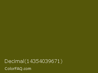 Decimal 14354039671 Color is a very dark yellow color and the nearest color is Saratoga #555b10. Hex code #555709 and RGB value is rgb(85,87,9). In RGB color space, this color is composed of 33% red, 34% green, 4% blue, In CMYK color space, this color is composed of 2% cyan, 0% magenta, 90% yellow , 66% black , In HSL color space, this color has a hue angle of 62° , 81% saturation and 19% lightness.