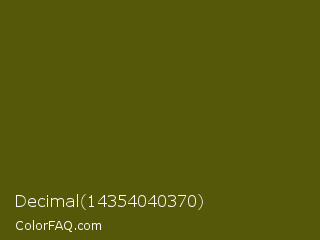 Decimal 14354040370 Color is a very dark yellow color and the nearest color is Saratoga #555b10. Hex code #555808 and RGB value is rgb(85,88,8). In RGB color space, this color is composed of 33% red, 35% green, 3% blue, In CMYK color space, this color is composed of 3% cyan, 0% magenta, 91% yellow , 65% black , In HSL color space, this color has a hue angle of 62° , 83% saturation and 19% lightness.