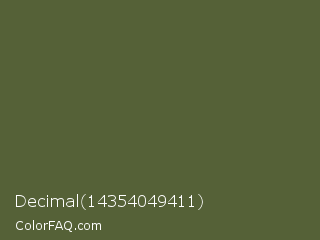 Decimal 14354049411 Color is a dark lime color and the nearest color is Verdigris #5d5e37. Hex code #556137 and RGB value is rgb(85,97,55). In RGB color space, this color is composed of 33% red, 38% green, 22% blue, In CMYK color space, this color is composed of 12% cyan, 0% magenta, 43% yellow , 62% black , In HSL color space, this color has a hue angle of 77° , 28% saturation and 30% lightness.
