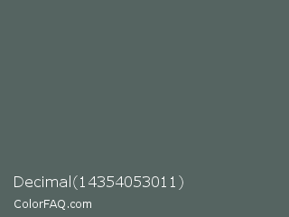 Decimal 14354053011 Color is a normal cyan color and the nearest color is Stormcloud #4f666a. Hex code #556461 and RGB value is rgb(85,100,97). In RGB color space, this color is composed of 33% red, 39% green, 38% blue, In CMYK color space, this color is composed of 15% cyan, 0% magenta, 3% yellow , 61% black , In HSL color space, this color has a hue angle of 168° , 8% saturation and 36% lightness.