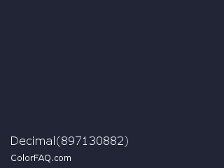 Decimal 897130882 Color is a very dark blue color and the nearest color is Steel Gray #262335. Hex code #222536 and RGB value is rgb(34,37,54). In RGB color space, this color is composed of 13% red, 15% green, 21% blue, In CMYK color space, this color is composed of 37% cyan, 31% magenta, 0% yellow , 79% black , In HSL color space, this color has a hue angle of 231° , 23% saturation and 17% lightness.