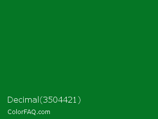 Decimal 3504421 Color is a dark green color and the nearest color is La Salle Green #087830. Hex code #057625 and RGB value is rgb(5,118,37). In RGB color space, this color is composed of 2% red, 46% green, 15% blue, In CMYK color space, this color is composed of 96% cyan, 0% magenta, 69% yellow , 54% black , In HSL color space, this color has a hue angle of 137° , 92% saturation and 24% lightness.