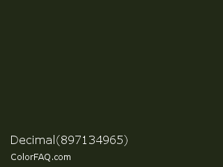 Decimal 897134965 Color is a very dark green color and the nearest color is Black Olive #242e16. Hex code #222917 and RGB value is rgb(34,41,23). In RGB color space, this color is composed of 13% red, 16% green, 9% blue, In CMYK color space, this color is composed of 17% cyan, 0% magenta, 44% yellow , 84% black , In HSL color space, this color has a hue angle of 83° , 28% saturation and 13% lightness.