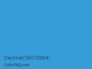 Decimal 56070994 Color is a normal blue color and the nearest color is Tufts Blue #3e8ede. Hex code #369dd8 and RGB value is rgb(54,157,216). In RGB color space, this color is composed of 21% red, 62% green, 85% blue, In CMYK color space, this color is composed of 75% cyan, 27% magenta, 0% yellow , 15% black , In HSL color space, this color has a hue angle of 202° , 68% saturation and 53% lightness.