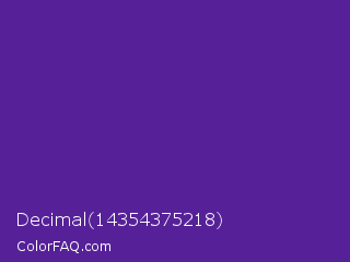 Decimal 14354375218 Color is a normal violet color and the nearest color is Daisy Bush #4f2398. Hex code #562198 and RGB value is rgb(86,33,152). In RGB color space, this color is composed of 34% red, 13% green, 60% blue, In CMYK color space, this color is composed of 43% cyan, 78% magenta, 0% yellow , 40% black , In HSL color space, this color has a hue angle of 267° , 64% saturation and 36% lightness.