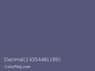 Decimal 14354481189 Color is a normal blue color and the nearest color is Comet #5c5d75. Hex code #565779 and RGB value is rgb(86,87,121). In RGB color space, this color is composed of 34% red, 34% green, 47% blue, In CMYK color space, this color is composed of 29% cyan, 28% magenta, 0% yellow , 53% black , In HSL color space, this color has a hue angle of 238° , 17% saturation and 41% lightness.