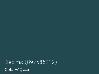 Decimal 897586212 Color is a very dark cyan color and the nearest color is Blue Dianne #204852. Hex code #224950 and RGB value is rgb(34,73,80). In RGB color space, this color is composed of 13% red, 29% green, 31% blue, In CMYK color space, this color is composed of 58% cyan, 9% magenta, 0% yellow , 69% black , In HSL color space, this color has a hue angle of 189° , 40% saturation and 22% lightness.