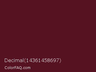 Decimal 14361458697 Color is a very dark red color and the nearest color is Maroon Oak #520c17. Hex code #571221 and RGB value is rgb(87,18,33). In RGB color space, this color is composed of 34% red, 7% green, 13% blue, In CMYK color space, this color is composed of 0% cyan, 79% magenta, 62% yellow , 66% black , In HSL color space, this color has a hue angle of 347° , 66% saturation and 21% lightness.