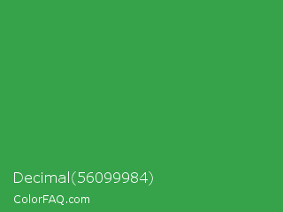 Decimal 56099984 Color is a normal green color and the nearest color is Chateau Green #40a860. Hex code #36a24a and RGB value is rgb(54,162,74). In RGB color space, this color is composed of 21% red, 64% green, 29% blue, In CMYK color space, this color is composed of 67% cyan, 0% magenta, 54% yellow , 36% black , In HSL color space, this color has a hue angle of 131° , 50% saturation and 42% lightness.