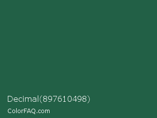 Decimal 897610498 Color is a dark green color and the nearest color is Green Pea #1d6142. Hex code #226046 and RGB value is rgb(34,96,70). In RGB color space, this color is composed of 13% red, 38% green, 27% blue, In CMYK color space, this color is composed of 65% cyan, 0% magenta, 27% yellow , 62% black , In HSL color space, this color has a hue angle of 155° , 48% saturation and 25% lightness.