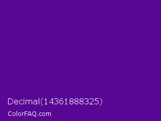 Decimal 14361888325 Color is a normal purple color and the nearest color is Purple #660099. Hex code #580795 and RGB value is rgb(88,7,149). In RGB color space, this color is composed of 35% red, 3% green, 58% blue, In CMYK color space, this color is composed of 41% cyan, 95% magenta, 0% yellow , 42% black , In HSL color space, this color has a hue angle of 274° , 91% saturation and 31% lightness.