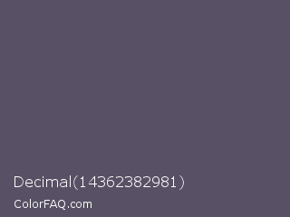 Decimal 14362382981 Color is a normal violet color and the nearest color is Scarpa Flow #585562. Hex code #585065 and RGB value is rgb(88,80,101). In RGB color space, this color is composed of 35% red, 31% green, 40% blue, In CMYK color space, this color is composed of 13% cyan, 21% magenta, 0% yellow , 60% black , In HSL color space, this color has a hue angle of 263° , 12% saturation and 35% lightness.