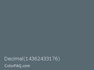 Decimal 14362433176 Color is a normal blue color and the nearest color is Cadet #536872. Hex code #586972 and RGB value is rgb(88,105,114). In RGB color space, this color is composed of 35% red, 41% green, 45% blue, In CMYK color space, this color is composed of 23% cyan, 8% magenta, 0% yellow , 55% black , In HSL color space, this color has a hue angle of 201° , 13% saturation and 40% lightness.