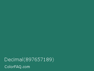 Decimal 897657189 Color is a dark cyan color and the nearest color is Genoa #15736b. Hex code #227665 and RGB value is rgb(34,118,101). In RGB color space, this color is composed of 13% red, 46% green, 40% blue, In CMYK color space, this color is composed of 71% cyan, 0% magenta, 14% yellow , 54% black , In HSL color space, this color has a hue angle of 168° , 55% saturation and 30% lightness.